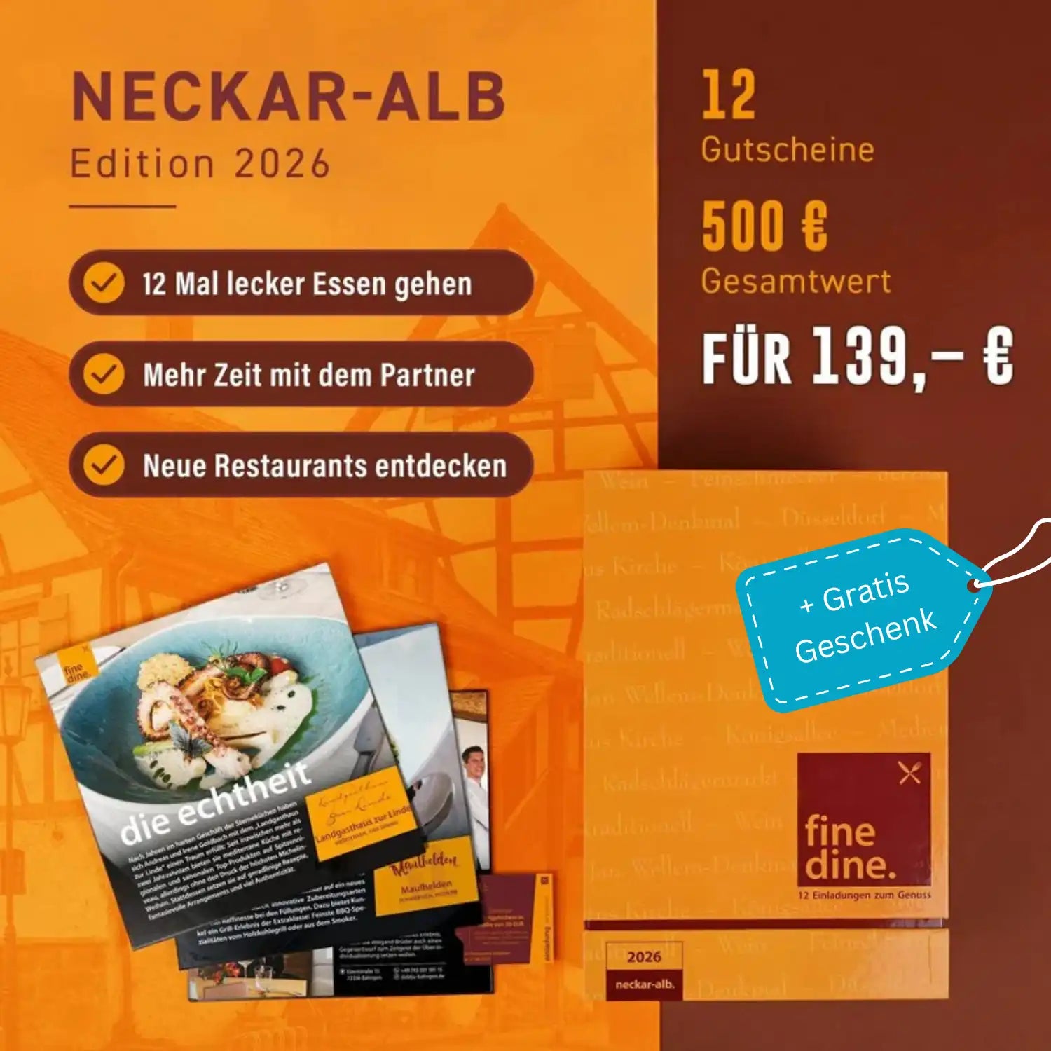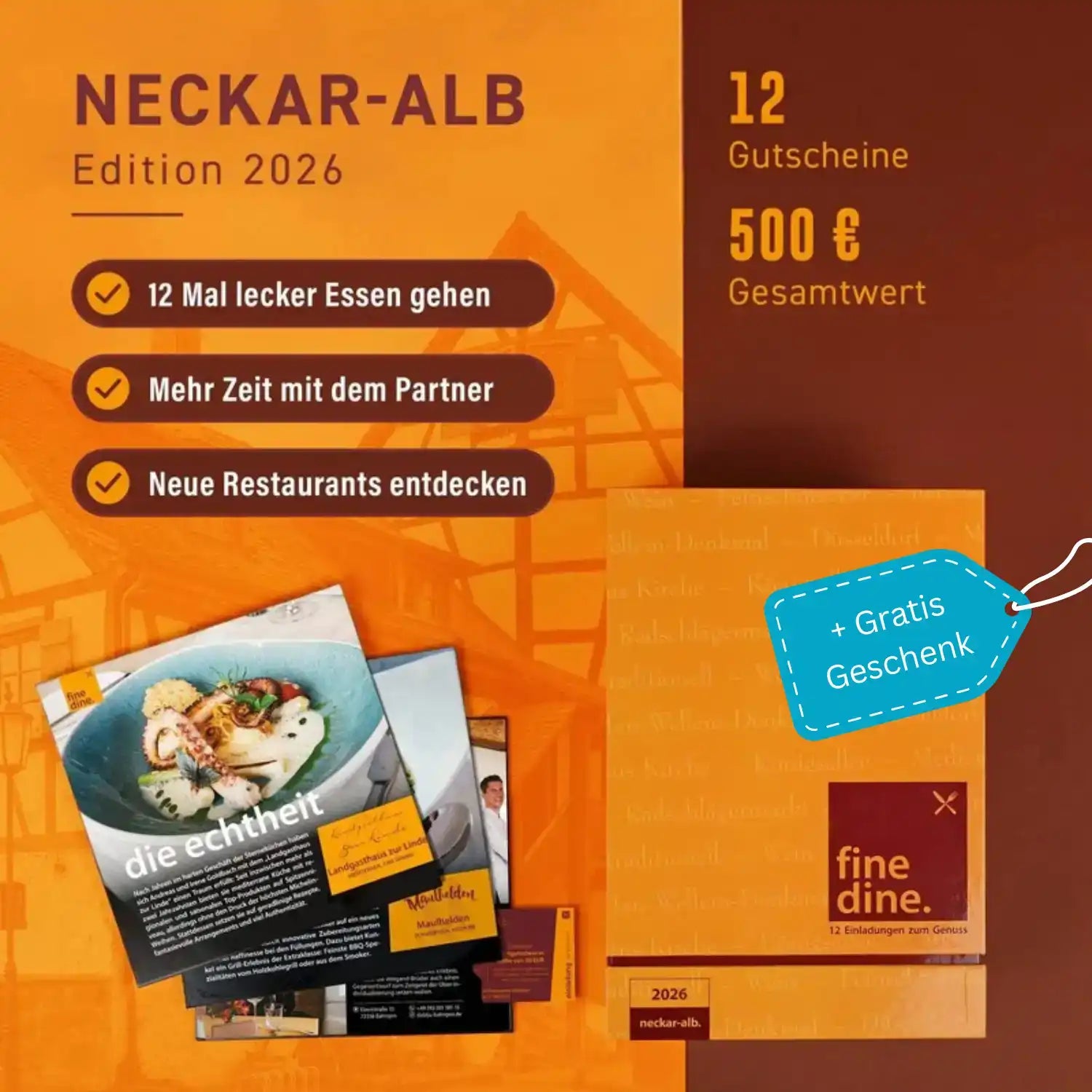 Zwölf ausgewählte Restaurants in der Region Neckar-Alb freuen sich darauf, Sie als Gast begrüßen und mit ihrem kulinarischen Angebot verwöhnen zu dürfen. Jedes Restaurant, das in der Fine Dine Box Neckar-Alb präsentiert wird, zeichnet sich durch eine hervorragende Qualität seiner Speisen, eine eindrucksvolle Auswahl und einen erstklassigen Service aus. Jedem wohnt ein ganz besonderer Charme inne, sodass Ihr Besuch stets von dem gewissen Extra gekrönt wird.
